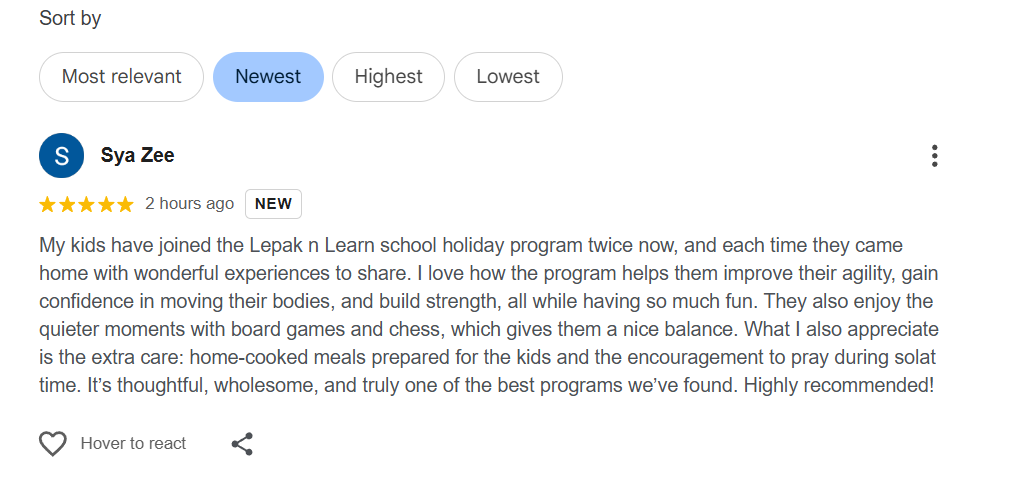 My kids have joined the Lepak n Learn school holiday program twice now, and each time they came home with wonderful experiences to share. I love how the program helps them improve their agility, gain confidence in moving their bodies, and build strength, all while having so much fun. They also enjoy the quieter moments with board games and chess, which gives them a nice balance. What I also appreciate is the extra care: home-cooked meals prepared for the kids and the encouragement to pray during solat time. It’s thoughtful, wholesome, and truly one of the best programs we’ve found. Highly recommended!
